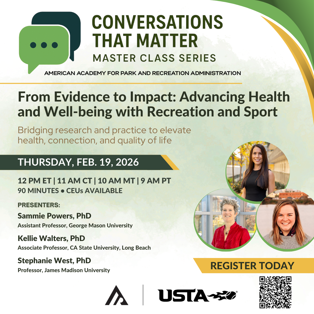 26Jan2026 Read more Conversations that Matter: From Evidence to Impact: Advancing Health and Well-being with Recreation and Sport Thursday February 19, 2026: START TIME: 9:00 AM PT | 10:00 AM MT | 11:00 AM CT | 12:00 PM ET (90 minutes) CEUs: 0.1 CEUs are available for this session. Advance registration required. This Master Class will explore evidence-based strategies for promoting and enhancing health and well-being through intentionally designed recreation and sport programming. The session will provide valuable insights into the transformative impact of sport and recreation participation across diverse user groups. Attendees will learn how recreation professionals, educators, and practitioners can design and implement inclusive, engaging opportunities that foster physical activity, mental health, social connections, and overall quality of life. Visit the Conversations That Matter site for the full 2026 schedule.